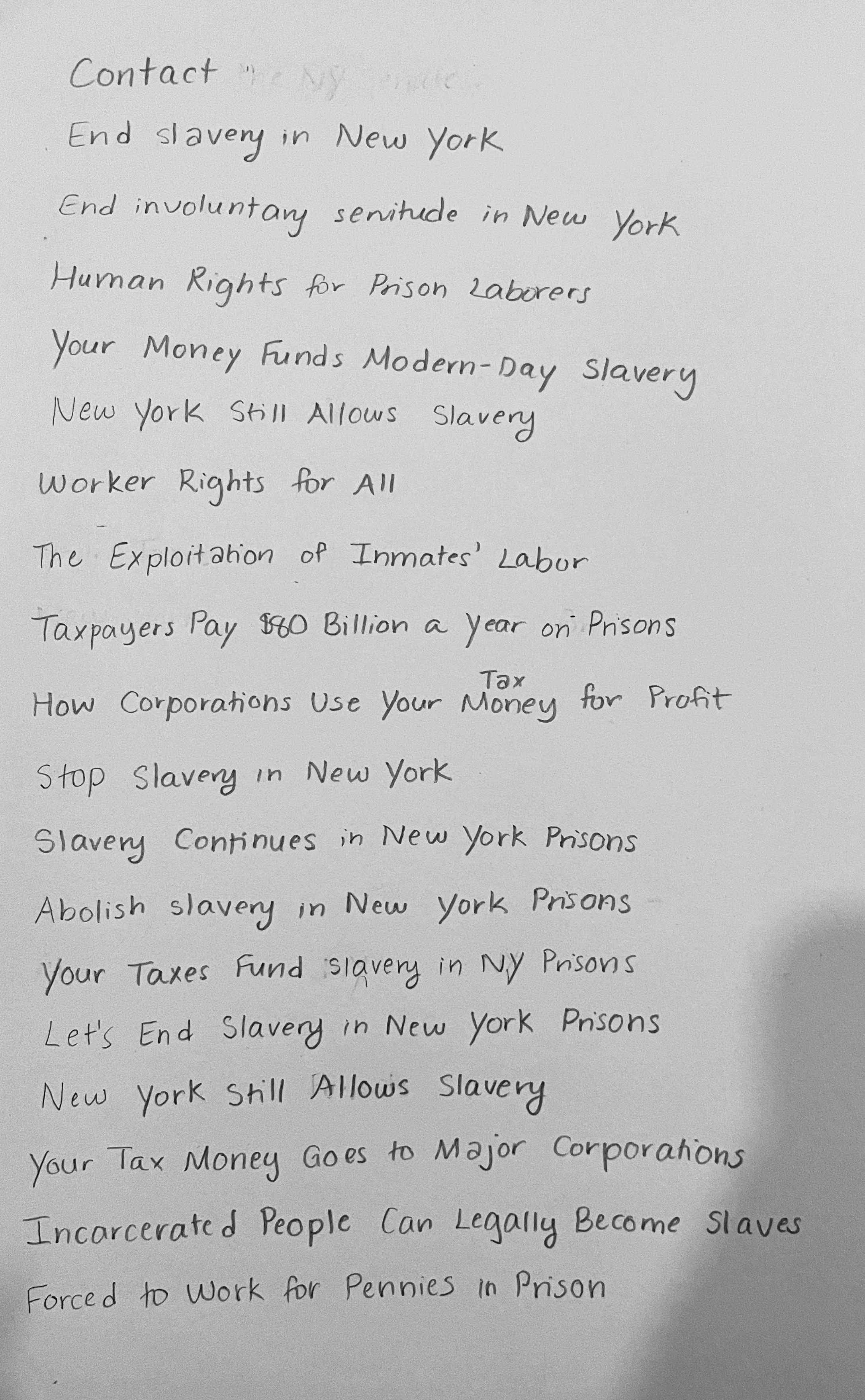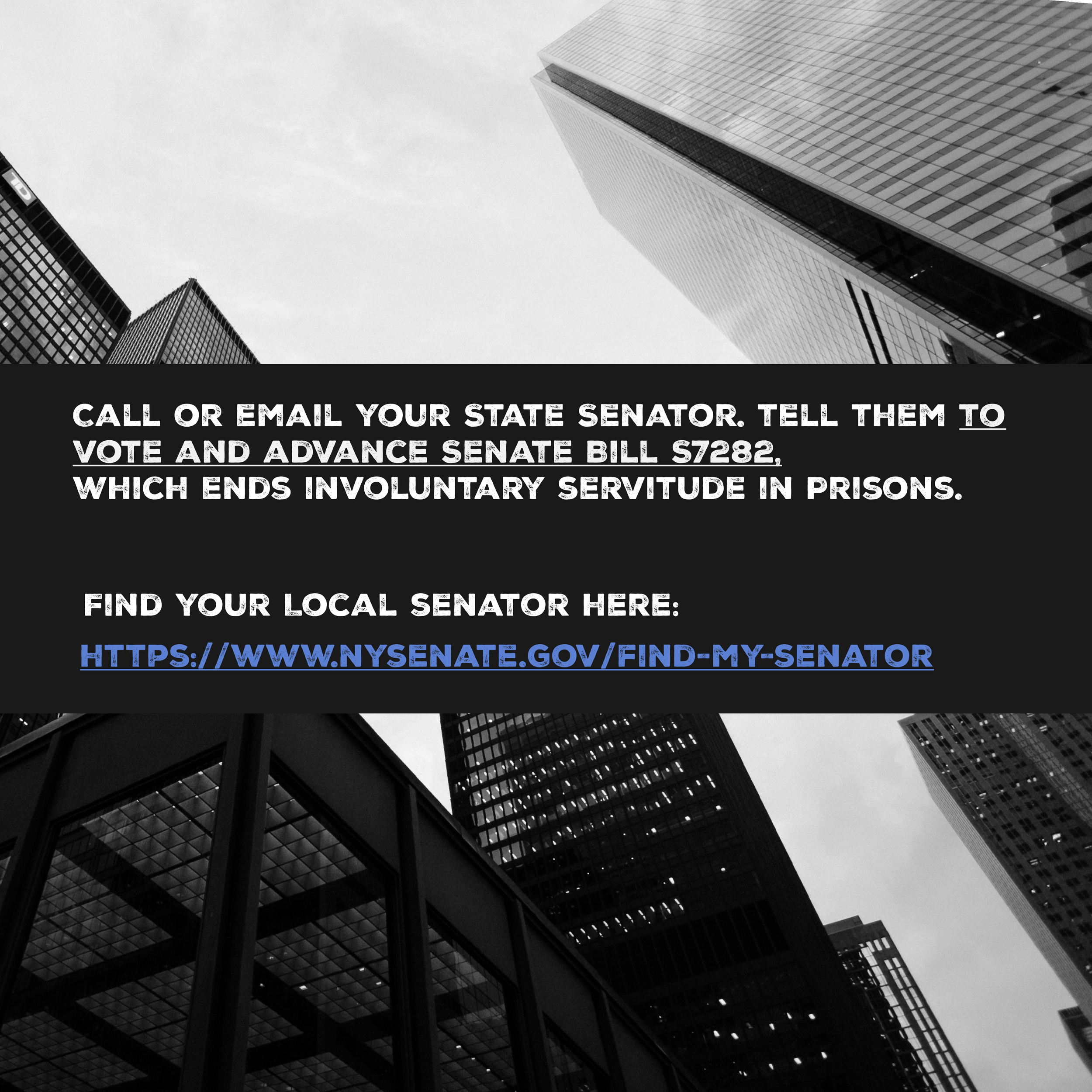 The goal is to encourage people to contact their local senator and tell them to push the bill S7282 forward. According to nysenate.gov, this bill “ends involuntary servitude in correctional facilities in New York state.”