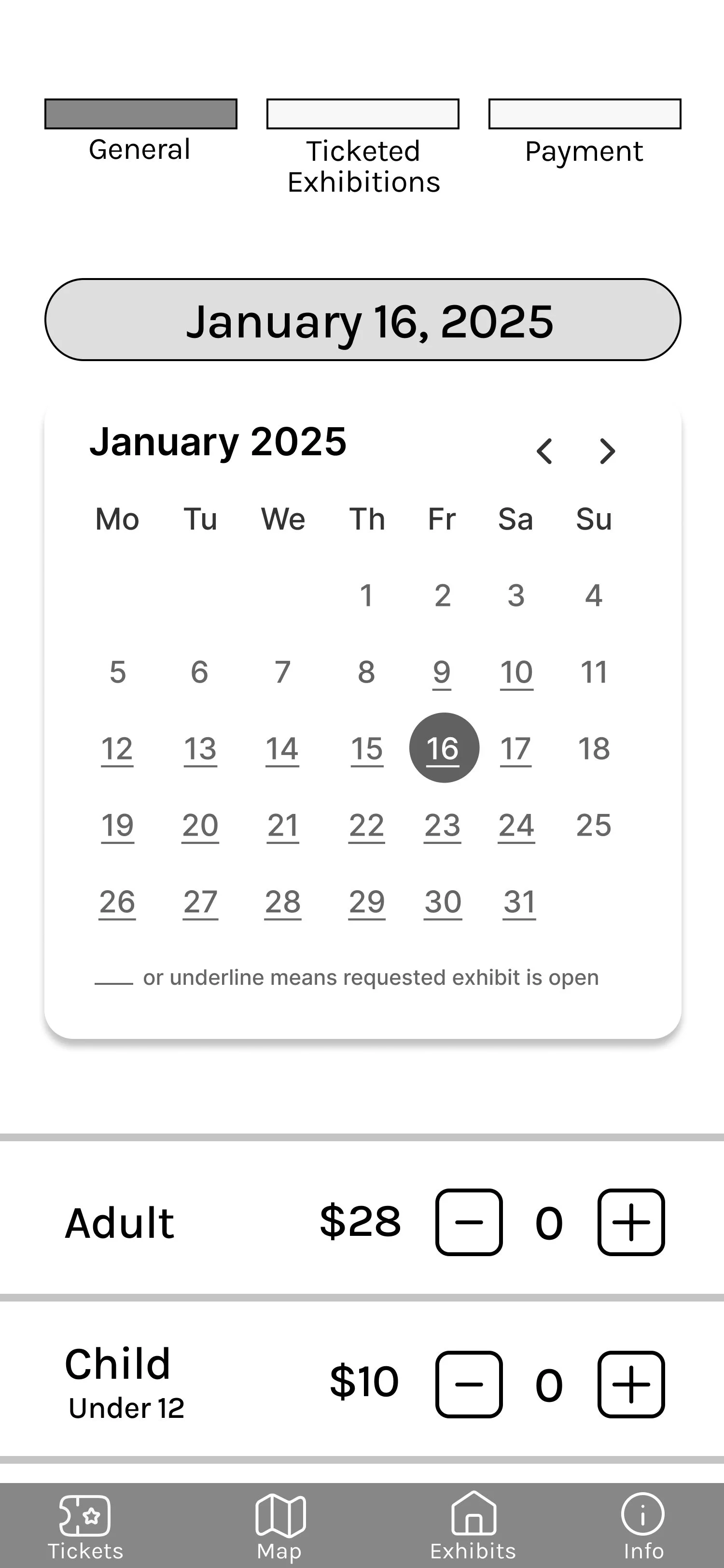 On the calendar screen, if users select Book Now of a specific exhibit, they can see the days it is available on the calendar because the dates are underlined. This would make it easier for them to know which days they can book for that exhibit.