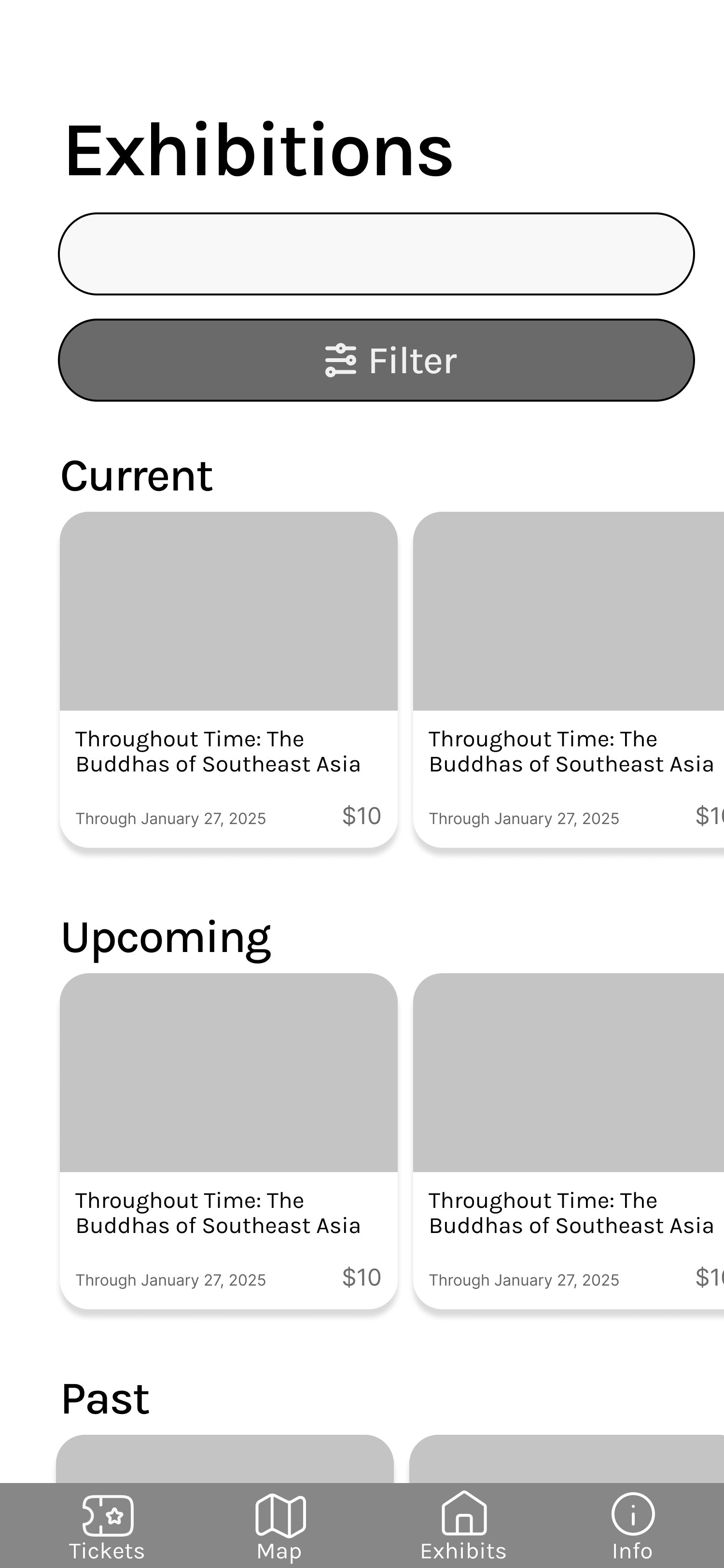 Secondly, I grouped the cards I made by status like current and upcoming exhibits. This way users can navigate the many exhibits on one exhibit overview page.