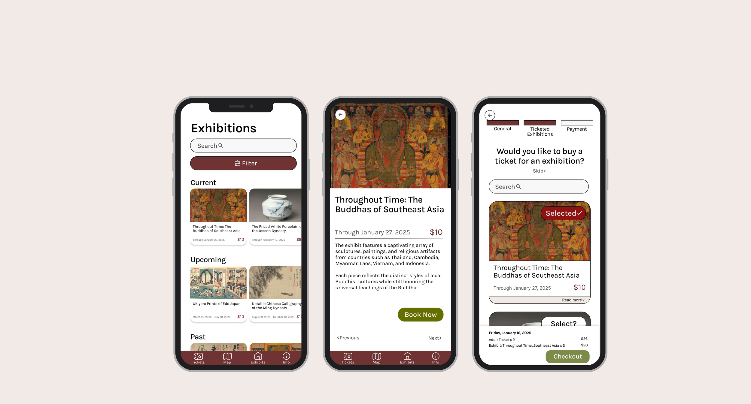 On the fourth screen, I could have designed a smaller card that results in less scrolling when buying tickets for exhibitions.